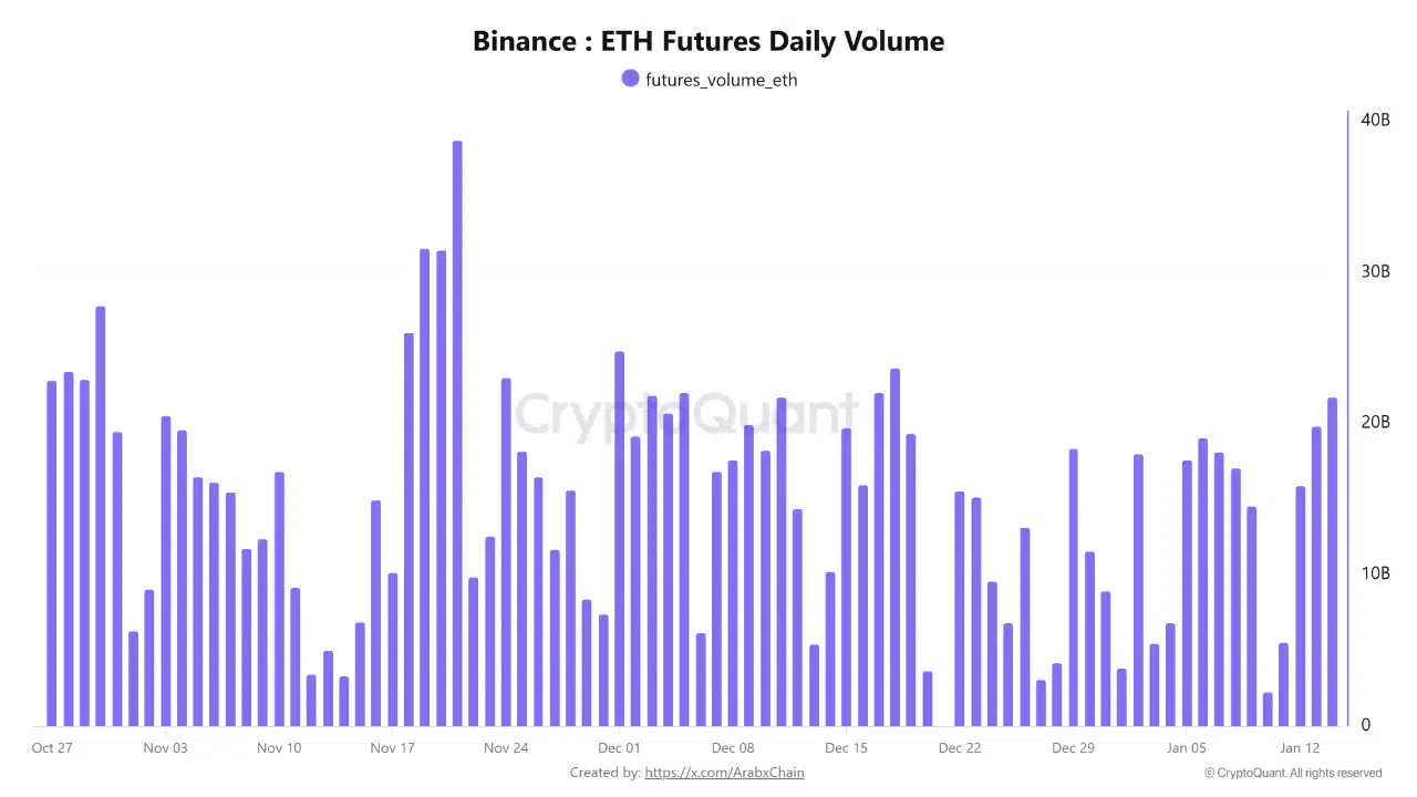 O relatório do grupo Arab Chain, divulgado no QuickTake da CryptoQuant, mostra que o volume diário de futuros de Ethereum na Binance atingiu US$ 21,7 bilhões. Esse número marca o ponto mais alto desde meados de dezembro e revela uma retomada clara da intensidade no mercado de derivativos.