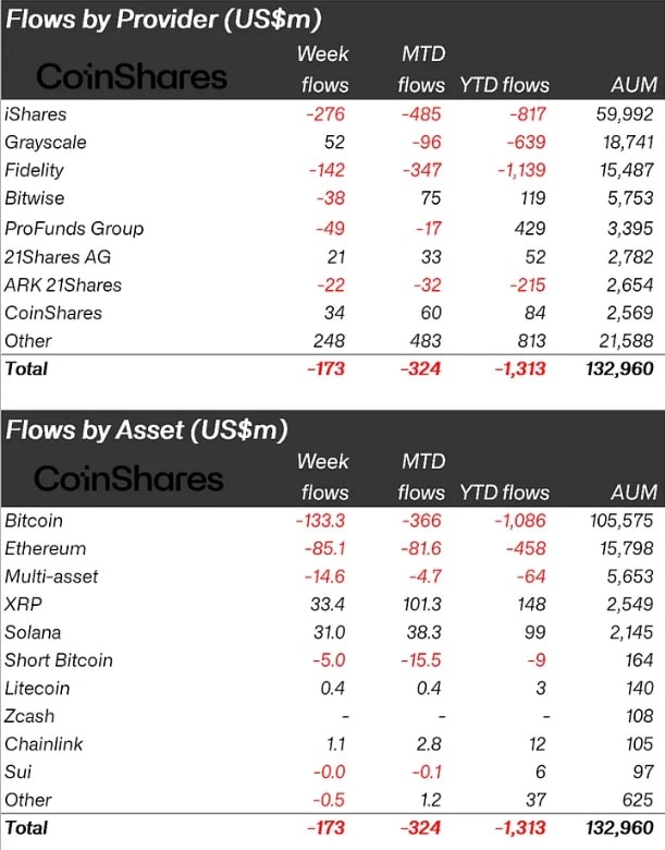 - Os fundos de criptomoedas registraram a quarta semana consecutiva de saídas, com total de US$ 173 milhões, elevando os saques para US$ 3,74 bilhões