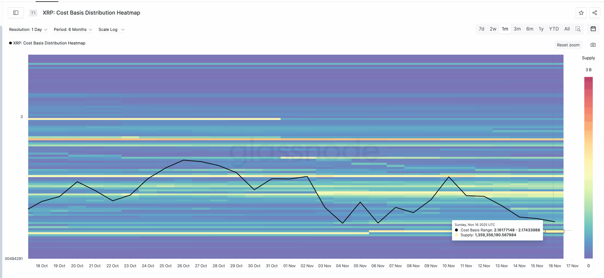 Mesmo com esse cenário, a zona de US$ 2,154 permanece resiliente. Além de ser um ponto técnico relevante, ela coincide com um grande bloco de oferta entre US$ 2,161 e US$ 2,174, onde 1,359 bilhão de tokens mudou de mãos. Esse conjunto funciona como o suporte mais firme no curto prazo. Por isso, o preço testando US$ 2,154 pode decidir se o XRP dá o salto ou se aprofunda a correção.