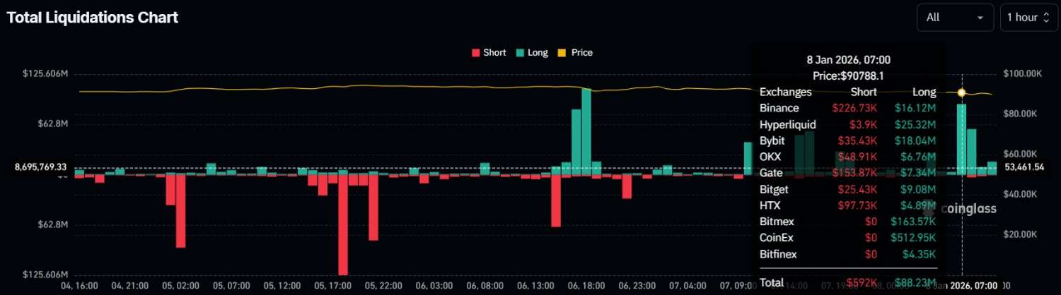 O primeiro choque ocorreu por volta das 7h (UTC). Nesse momento, US$ 88,23 milhões desapareceram em liquidações automáticas. Logo depois, às 8h (UTC), mais US$ 57,02 milhões foram eliminados, reforçando o clima tenso entre operadores alavancados. Os números, divulgados pelo CoinGlass, mostraram uma velocidade rara até para padrões de alta volatilidade.