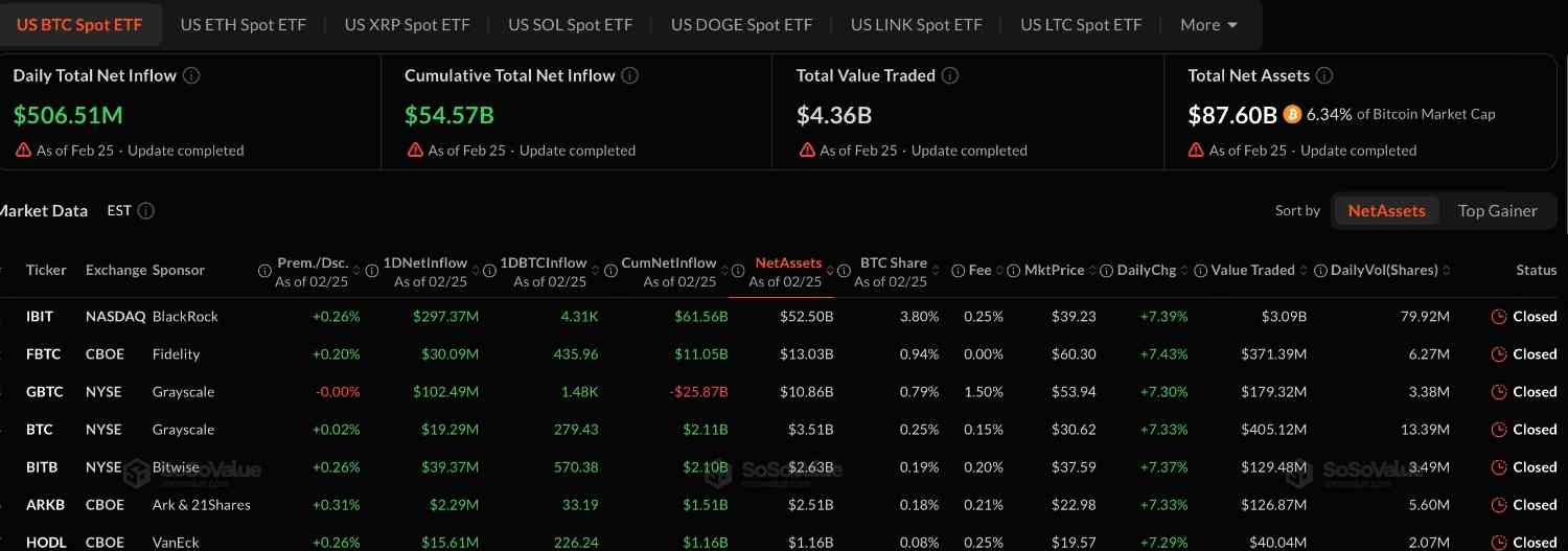 Os ETFs de Bitcoin nos Estados Unidos voltaram a atrair forte interesse. Eles registraram entradas de mais de US$ 506 milhões ontem, 25 de fevereiro, algo não visto desde 2 de fevereiro. Esse avanço sinaliza movimentação renovada após semanas de cautela.