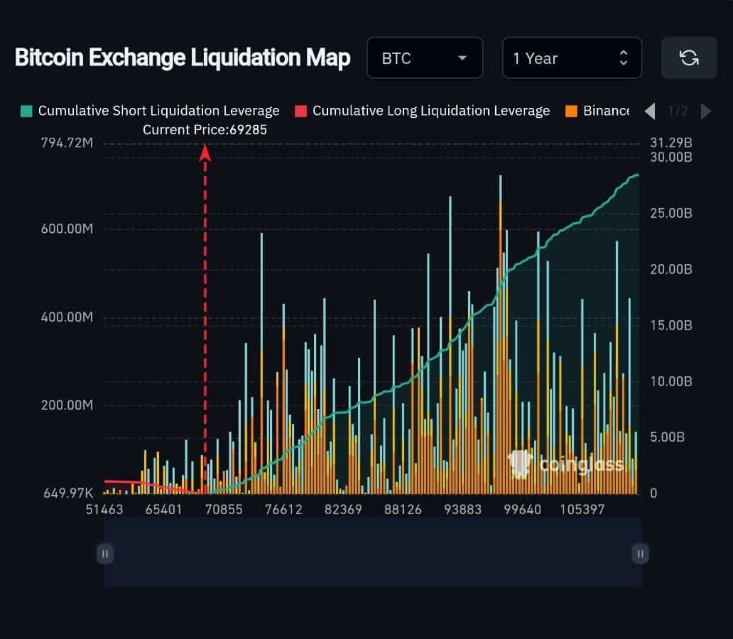 O preço do Bitcoin está sendo negociado em US$ 71.400, os dados indicam um agrupamento denso de potenciais liquidações de vendidos, que aumenta rapidamente conforme o preço avança.