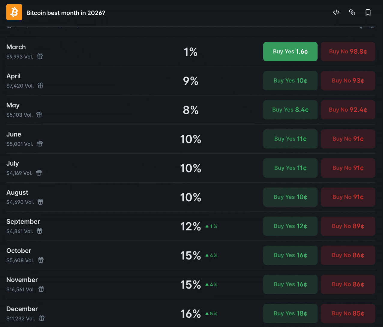 Os dados da plataforma Polymarket revelam que dezembro lidera as expectativas, com 16% de probabilidade de ser o melhor mês para o Bitcoin em 2026. Logo atrás aparecem outubro e novembro, com 15% cada.