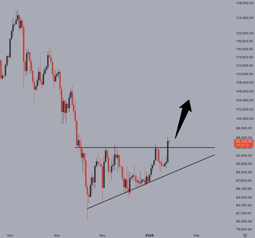 O trader Jelle identificou o rompimento de um padrão de triângulo descendente, mas pediu cautela. Já CrypNeuvo alertou para uma possível rejeição na EMA de 50 semanas, perto de US$ 97.650, embora reconheça que superar US$ 100 mil invalidaria o risco.