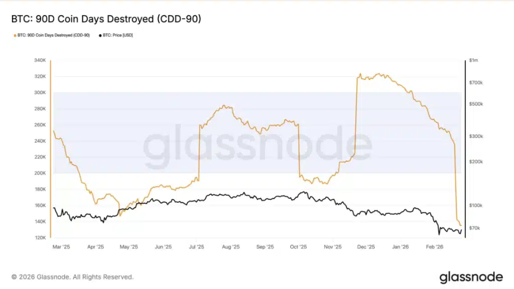 A Glassnode confirma o quadro. Desde dezembro de 2025, o indicador CDD-90 opera em níveis muito baixos. Porém, em fevereiro de 2026, algo chamou atenção. Enquanto o preço tentava se manter perto de US$ 70 mil, o CDD-90 não subiu. Em condições normais, investidores antigos reagiriam ao estresse. Mas isso não ocorreu.
