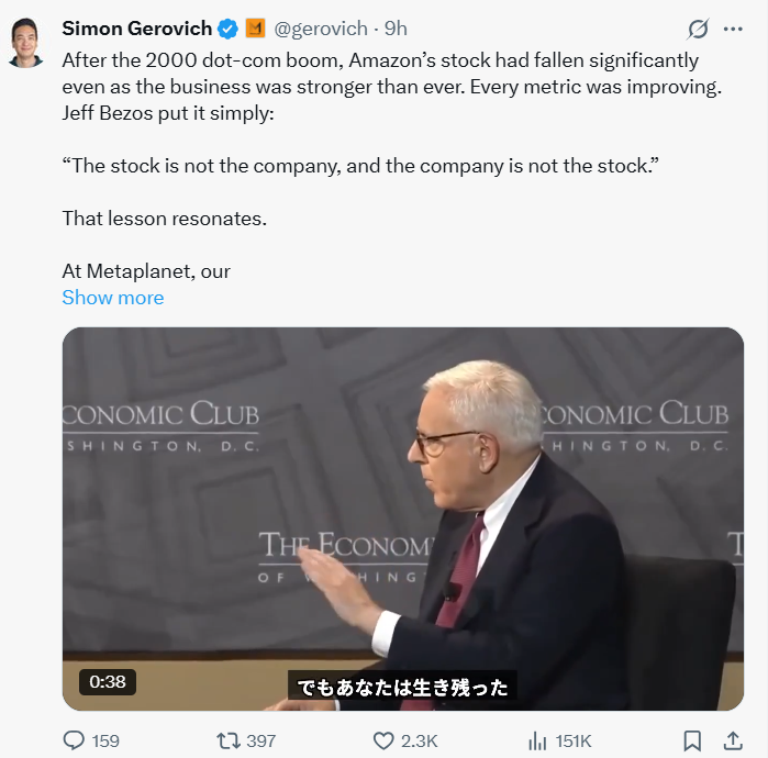 O CEO Simon Gerovich comparou a situação ao começo dos anos 2000, quando a Amazon crescia rápido, mas as ações despencavam após o estouro da bolha das pontocom. Ele citou Jeff Bezos: “A ação não é a empresa, e a empresa não é a ação”.