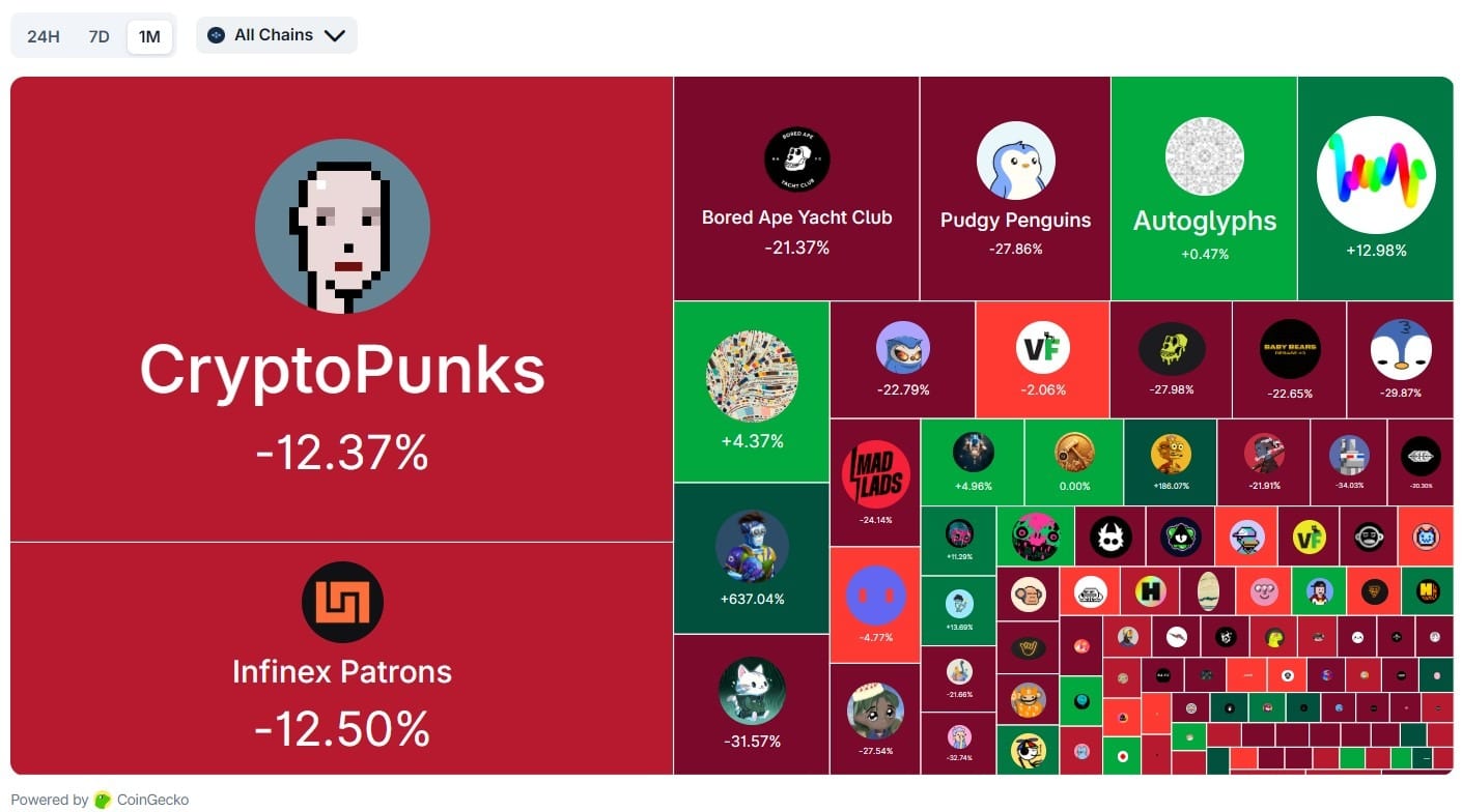 Mapa de calor de NFTs dos últimos 30 dias. Fonte: CoinGecko