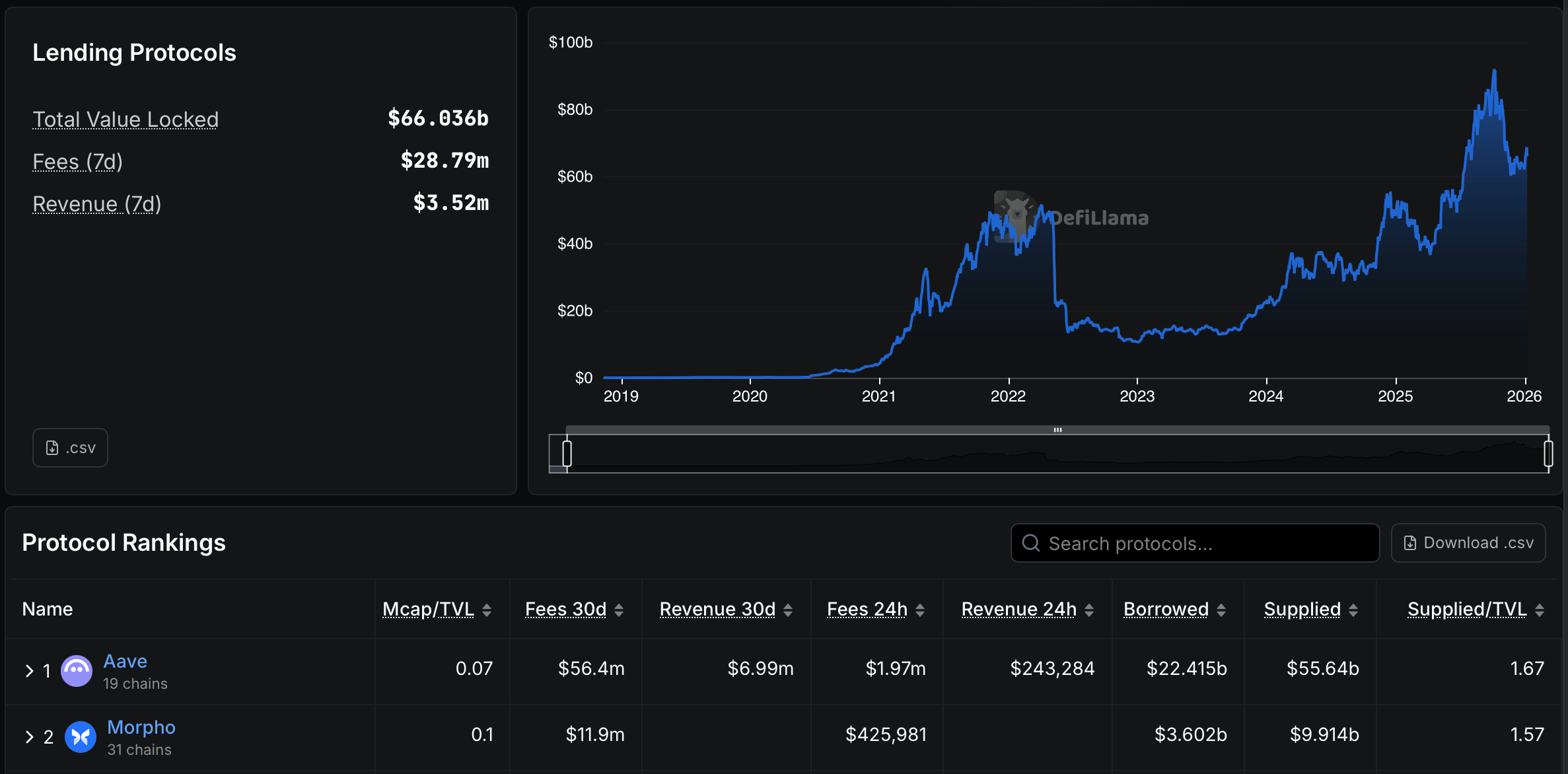 Após uma liquidação relevante em outubro, o mercado perdeu fôlego, mas se estabilizou em novembro. Atualmente, o TVL gira em torno de US$ 66 bilhões, indicando um novo equilíbrio.