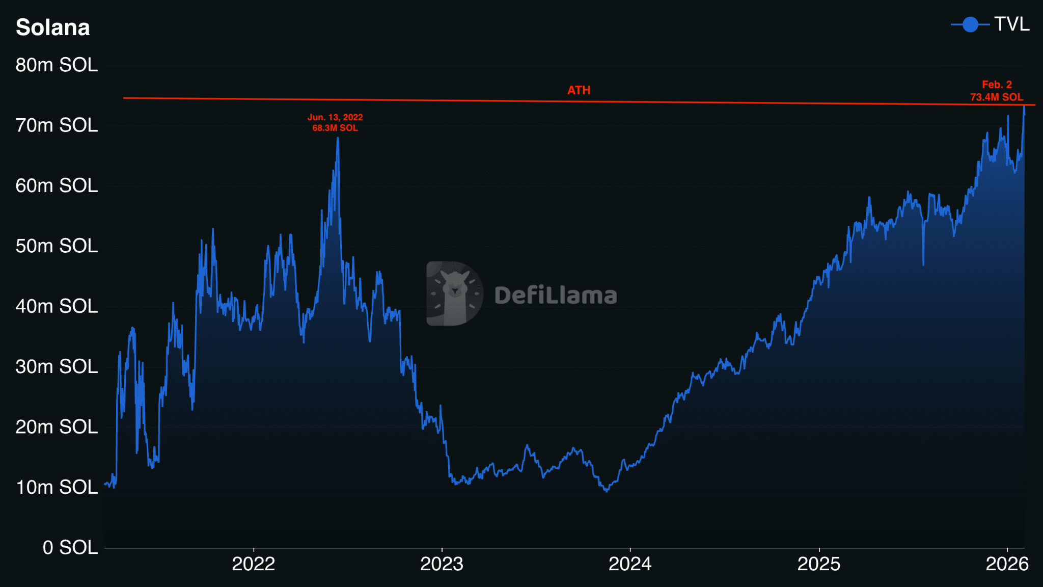Enquanto isso, os fundamentos da rede fortalecem o sentimento otimista. O TVL da Solana atingiu 73,4 milhões de SOL, maior valor já registrado, impulsionado pelo aumento de uso dos DApps. As transações diárias também alcançaram 109,5 milhões, maior nível em dois anos, enquanto a negociação nas DEXs marcou novos topos no período recente.