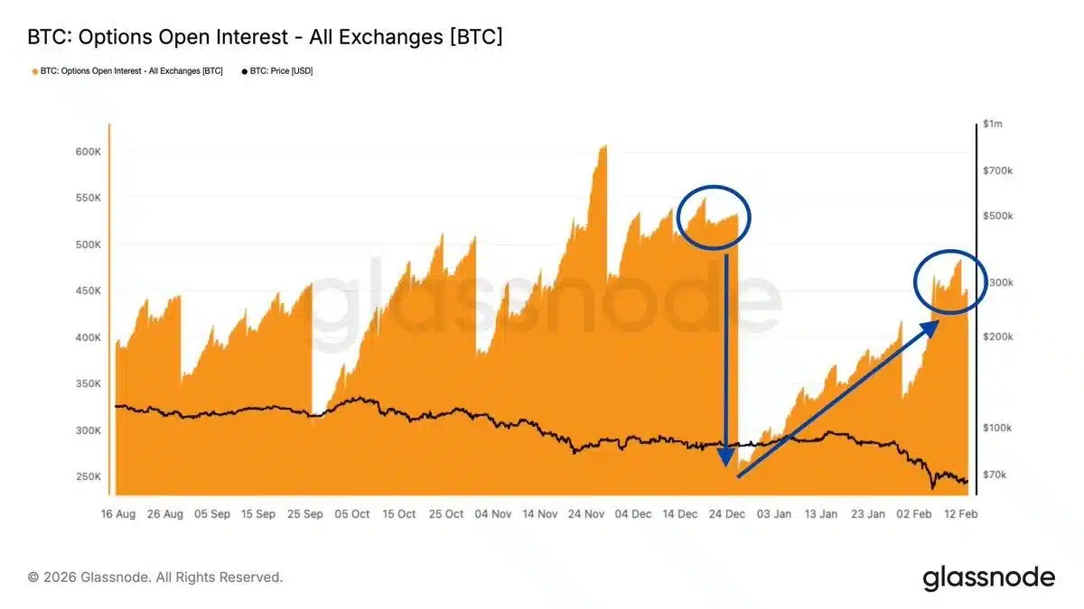 Dados recentes mostram que o Bitcoin segue preso entre US$ 65 mil e US$ 73 mil. A Glassnode registra um aumento notável no interesse em aberto, que voltou a 452.000 BTC, muito próximo da máxima do fim de 2025.