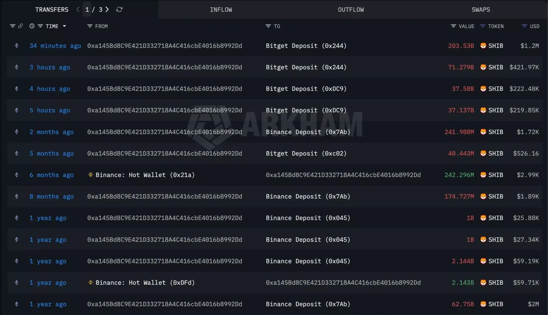 A carteira identificada pelo prefixo “0xa145Bd8C9E” realizou sua maior remessa ao enviar 203,53 bilhões de SHIB, avaliados em cerca de US$ 1,2 milhão, para a exchange. Horas antes, o mesmo endereço havia enviado 71,27 bilhões de SHIB, equivalentes a US$ 421 mil, além de duas transações menores próximas de 37 bilhões de tokens cada. Assim, a saída total representou quase 30% do saldo anterior da carteira.