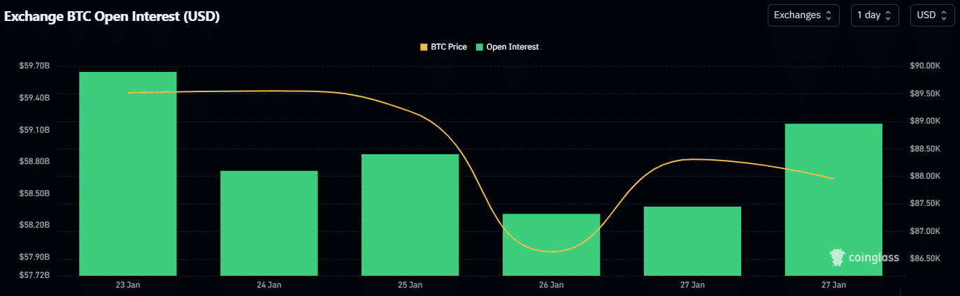 O volume de contratos em aberto se aproxima novamente de US$ 60 bilhões, e a alavancagem estimada sobe, deixando o mercado exposto a oscilações repentinas. O preço do Bitcoin permanece preso entre US$ 85 mil e US$ 90 mil, faixa que historicamente antecede rompimentos fortes em qualquer direção.