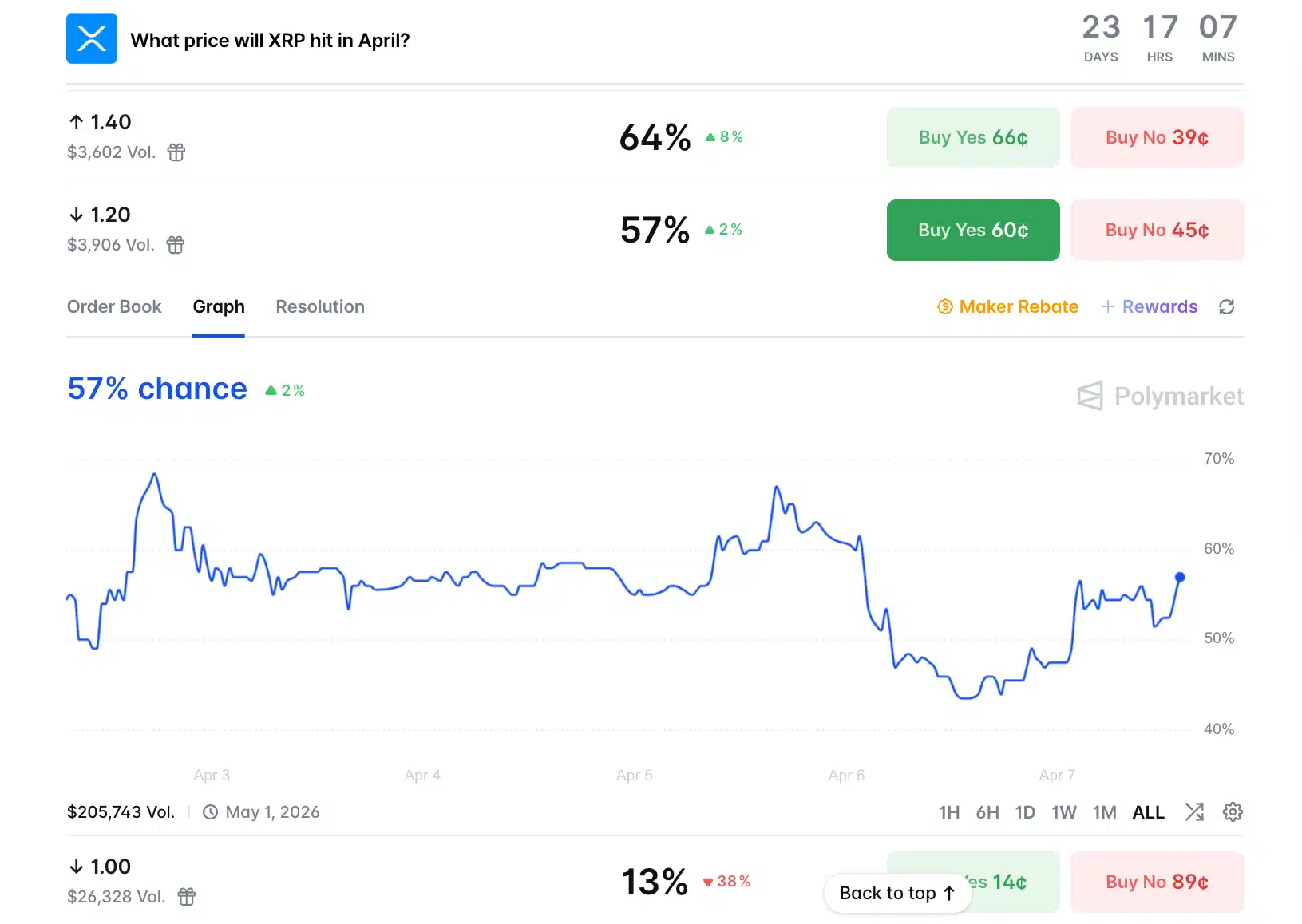 As apostas de mercado também reforçam esse cenário. Dados da Polymarket indicam 57% de probabilidade de o XRP atingir US$ 1,20 antes do fim de abril.