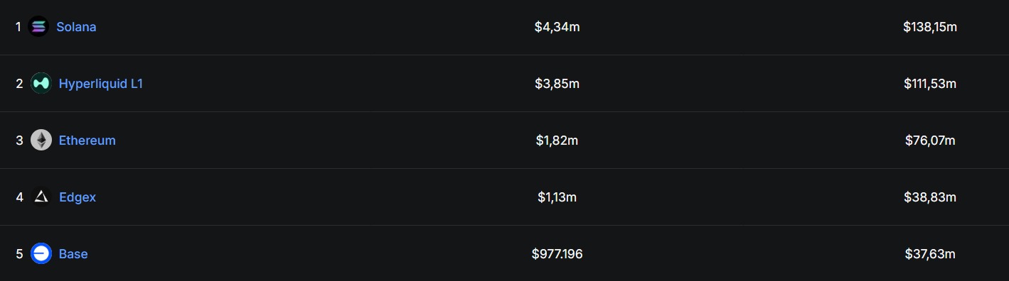 Enquanto isso, o Ethereum caiu para posições inferiores no ranking de receita. Ficou atrás não só da Solana, mas também da Hyperliquid, que somou US$ 3,85 milhões, e de redes menores como Edgex, Base da Coinbase e BSC, que também mostram sinais de atividade crescente.