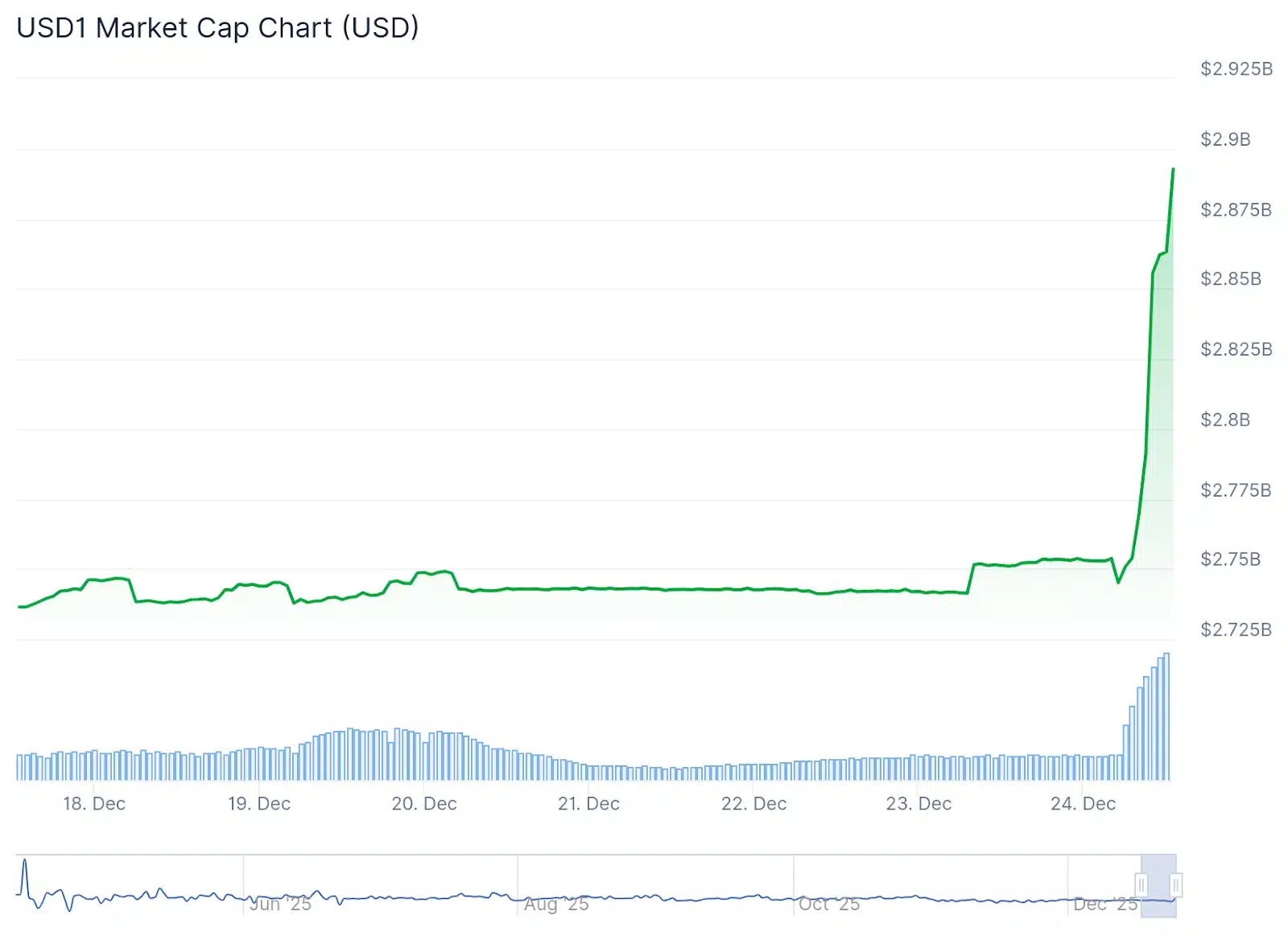 A USD1, emitida pela World Liberty Financial, viu seu valor de mercado subir de US$ 2,74 bilhões para US$ 2,89 bilhões, logo após o anúncio do programa que oferece até 20% de APR em depósitos acima de US$ 50 mil. A iniciativa funciona até 23 de janeiro de 2026 e paga bônus diários diretamente nas contas dos usuários da Binance, criando um apelo adicional em meio à busca global por rendimento.