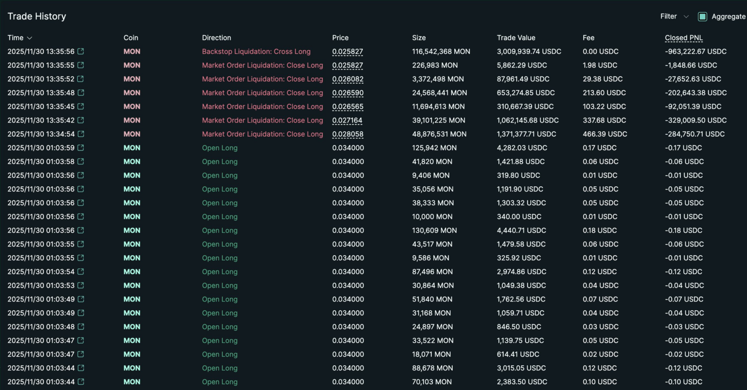 O trader abriu uma posição comprada perto de US$ 0,034, acreditando que o impulso inicial sustentaria a alta. Mas uma reversão repentina fez o MON despencar do topo intradiário e desencadeou um efeito dominó de liquidações. O token chegou a subir quase 99% em certo momento do dia, e a queda seguinte apagou todo aquele movimento.