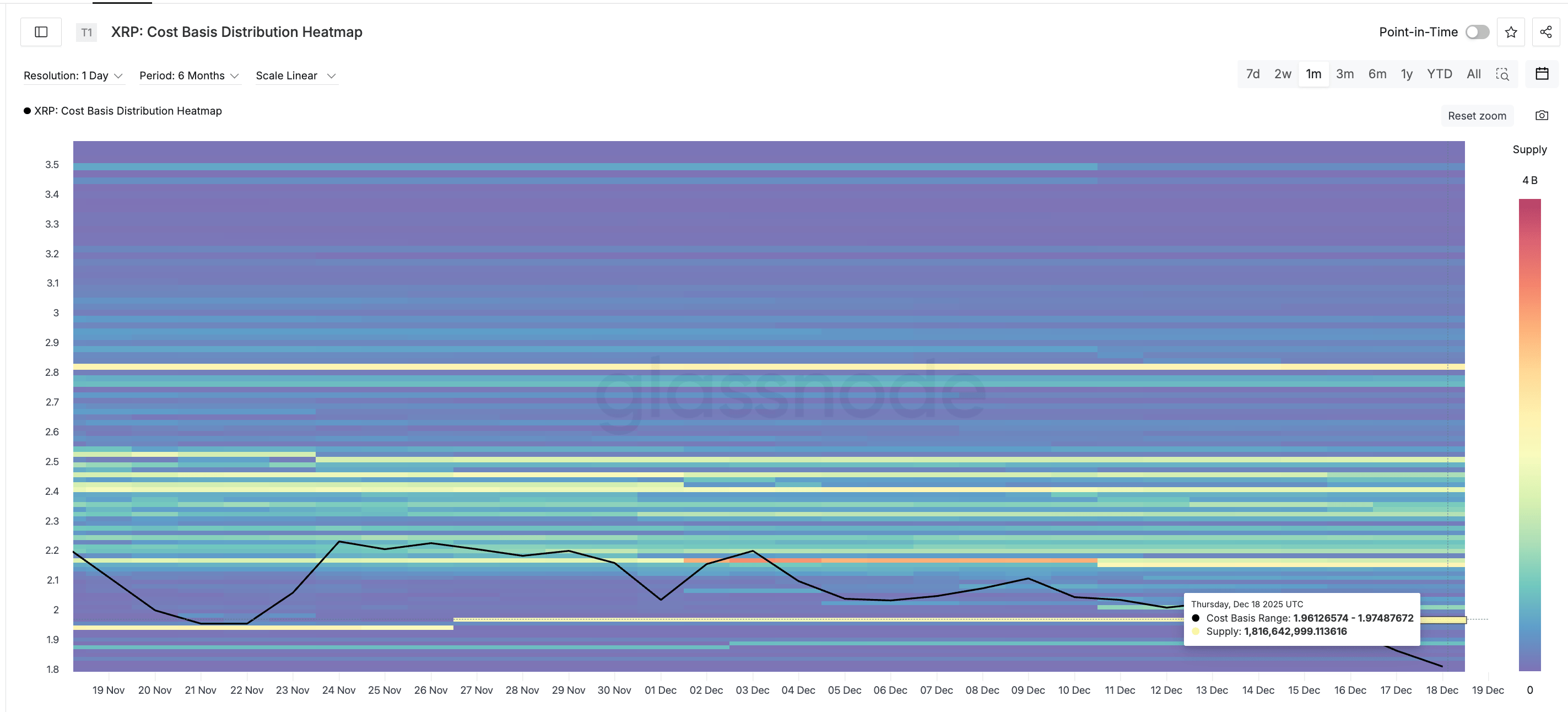 Os dados de custo base revelam uma forte concentração de oferta entre US$ 1,96 e US$ 1,97. Cerca de 1,82 bilhão de XRP foram comprados nessa região. Sempre que o preço retorna a esse nível, muitos investidores tentam vender no ponto de equilíbrio.