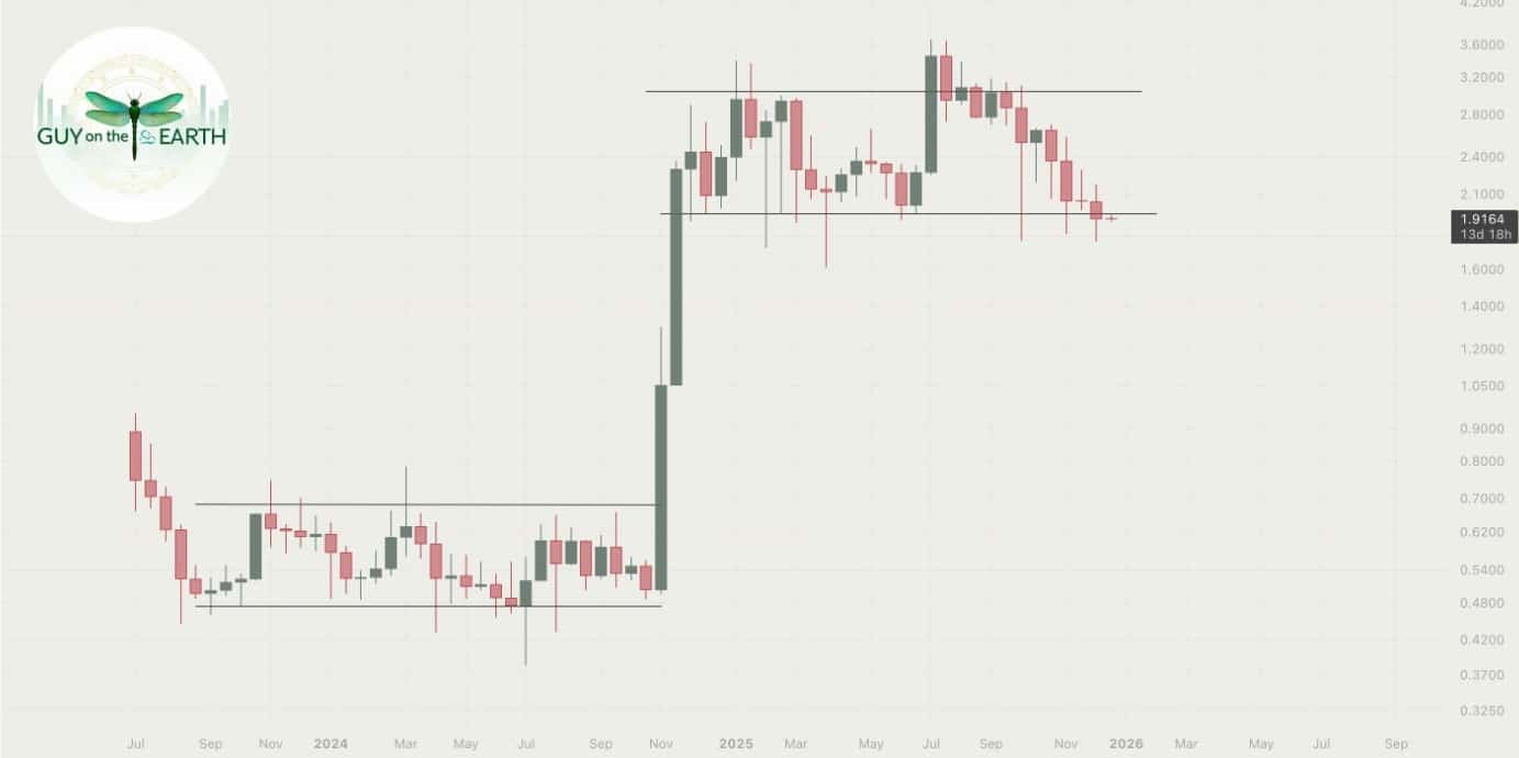 Guy on the Earth afirmou que, para evitar uma queda mais profunda, o XRP precisa retomar os US$ 1,95 o quanto antes. Ele também lembrou que a perda desse nível abre espaço para regiões de acumulação inferiores, como US$ 1,61, US$ 1,42 e US$ 0,90, com US$ 0,75 representando o rompimento inicial de uma alta anterior.