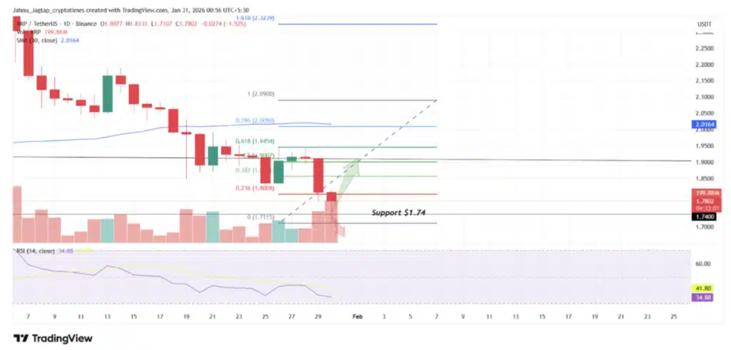 A pressão não ficou restrita à alavancagem. O XRP perdeu níveis técnicos importantes, incluindo a média móvel de 30 dias perto de US$ 2,02.