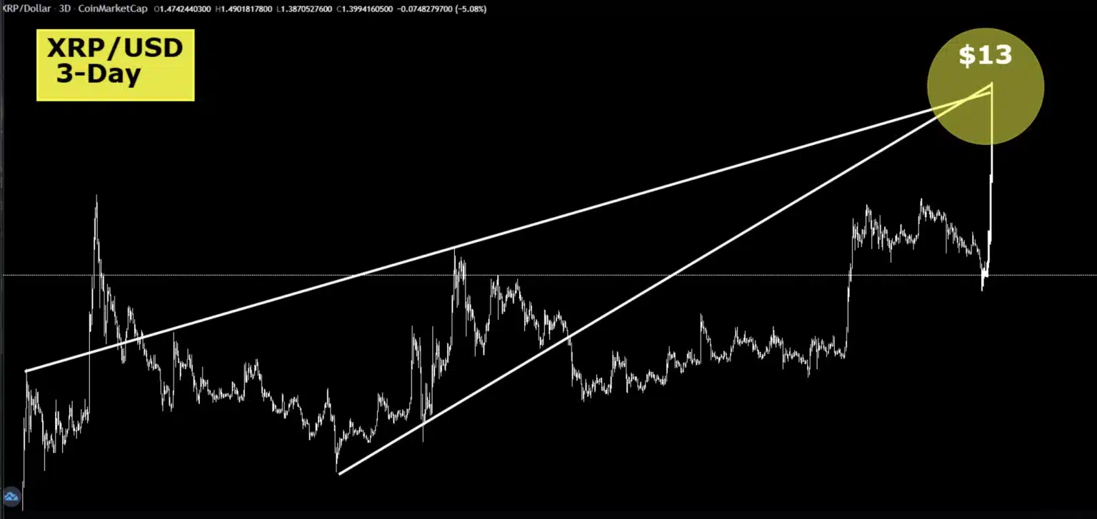 No gráfico, o XRP parece se mover dentro de uma formação ascendente. As linhas de tendência se estreitam gradualmente, enquanto o limite superior aponta diretamente para a região de US$ 13, descrita pelo analista como um possível “ímã de preço”.