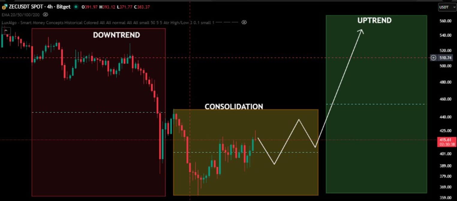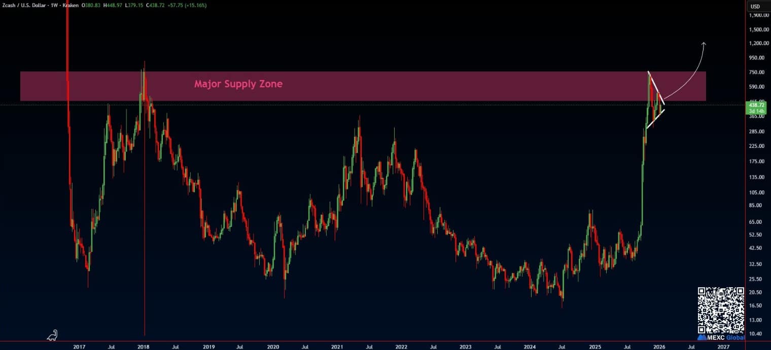 Daniel Ramsey apontou que o gráfico do ZEC formou uma flâmula de alta, padrão que costuma sinalizar continuação de tendência. Para ele, o token “se prepara para uma grande valorização”, caso rompa a região atual de oferta. O analista afirmou que o mercado mostra firmeza e pode mirar níveis próximos de US$ 500, caso o impulso continue.