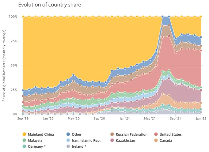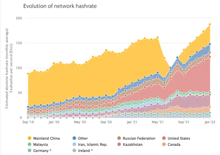 Em janeiro de 2022 os Estados Unidos se mantinha como o líder da mineração de Bitcoin representando 37,8% do mercado.