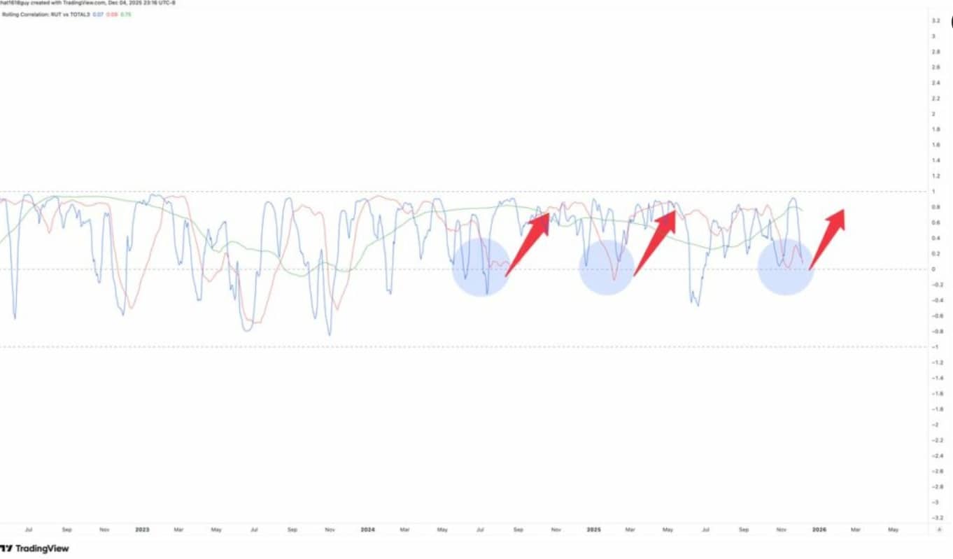 A correlação de longo prazo entre o Total 3, o índice que exclui Bitcoin e Ethereum, e o Russell 2000 fica perto de 0,75 desde o começo de 2024. Isso mostra que os dois mercados ainda reagem de forma parecida à liquidez e ao apetite global por risco. Mas as correlações de 30 e 90 dias caíram a níveis bem baixos, sinalizando um afastamento temporário entre os movimentos das small caps e das altcoins.
