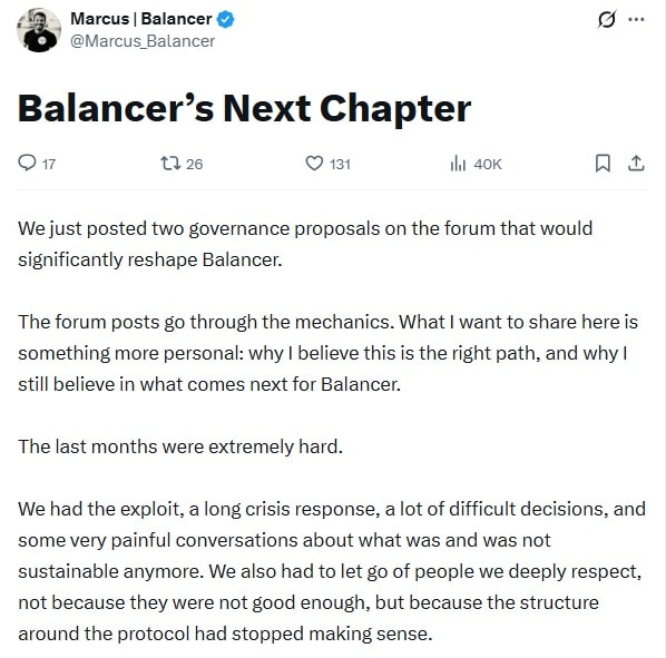 • Além disso, os executivos afirmam que o protocolo continuará ativo sob gestão mais descentralizada, com a Balancer Foundation e a DAO