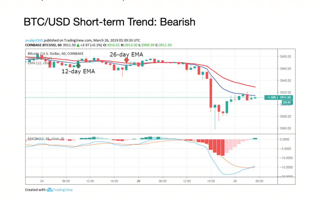 Ontem, 25 de março, o preço do Bitcoin estava em alta. Ontem, o preço do BTC depreciou ainda mais como resultado de sua queda anterior de sua resistência inicial no nível de preço de US $ 4.000. Presumiu-se ontem que, se os touros não conseguirem quebrar os EMAs, o preço da cripto cairá para a baixa anterior, de US $ 3.800. O preço da cripto, na verdade, caiu para o mínimo de US $ 3.899,12. Hoje, o preço da cripto está abaixo da MME de 12 dias e da MME de 26 dias, o que indica que o preço provavelmente cairá.