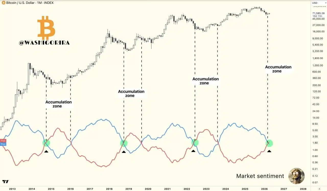 Apesar da fraqueza recente, outro indicador chama atenção e muda a perspectiva. O gráfico mensal sugere que o Bitcoin entrou em uma zona histórica de acumulação.