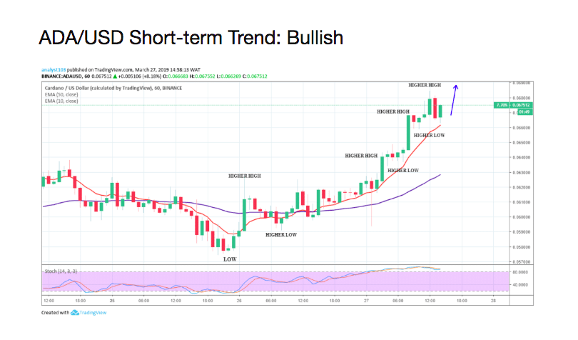 A cripto está em uma tendência de alta em sua perspectiva de curto prazo. A formação da morning star em US $ 0,05763 na área de demanda em 25 de março, retornou com os touros. A pressão de alta tem sido forte desde então, como o preço faz altas mais altas e baixas mais altas, isso é uma característica de mercado em alta.