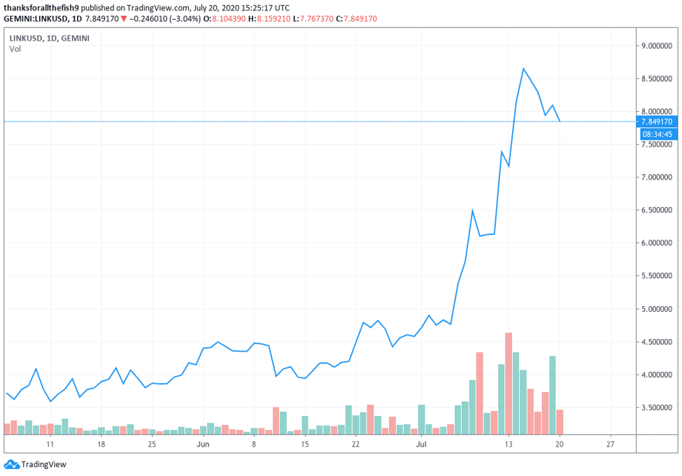 Nos últimos meses, desde o crash do mercado em março, a Chainlink tem registrado altas significativas em diversos indicadores. Recentemente, um movimento de baleias que impulsionou o valor da LINK, assim como de outras altcoins. Esse fato, aliado a outros fatores, fizeram com que a criptomoeda valorizasse 400%, além de atrair um grande aumento no seu uso.