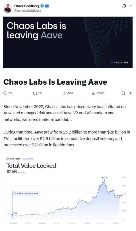 - A Chaos Labs está deixando o cargo de gestora oficial de riscos da Aave após mais de três anos