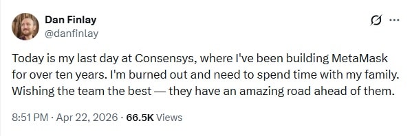 - Dan Finlay, cofundador da MetaMask, anunciou que está deixando a Consensys