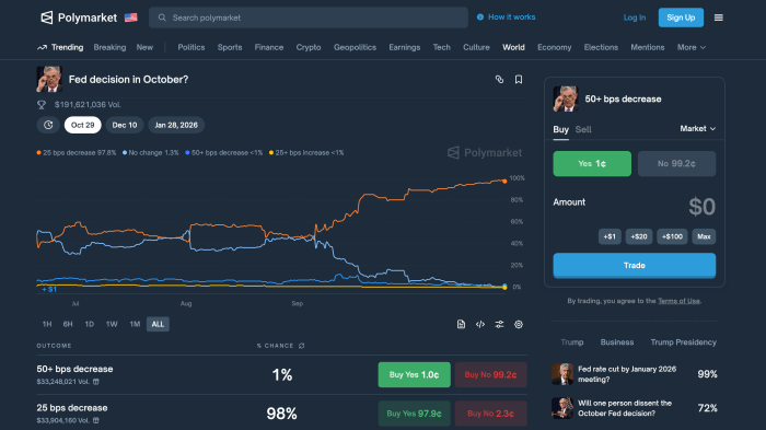 A Polymarket, que utiliza tecnologia blockchain para agregar apostas com dinheiro real, tem um histórico de previsões acertadas sobre decisões do Fed. Antes da reunião de setembro, por exemplo, os usuários da plataforma estimaram 91% de probabilidade de corte de 25 pontos-base, resultado que se confirmou integralmente.
