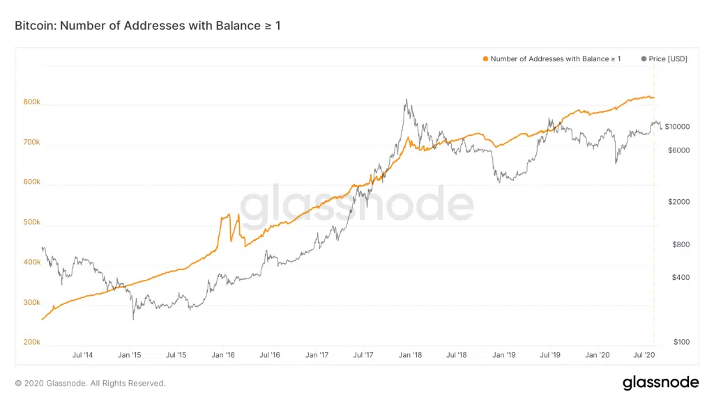 Outro dado que mostra uma evolução crescente de carteiras é o levantamento do número de endereços que possuem 1 ou mais Bitcoins.