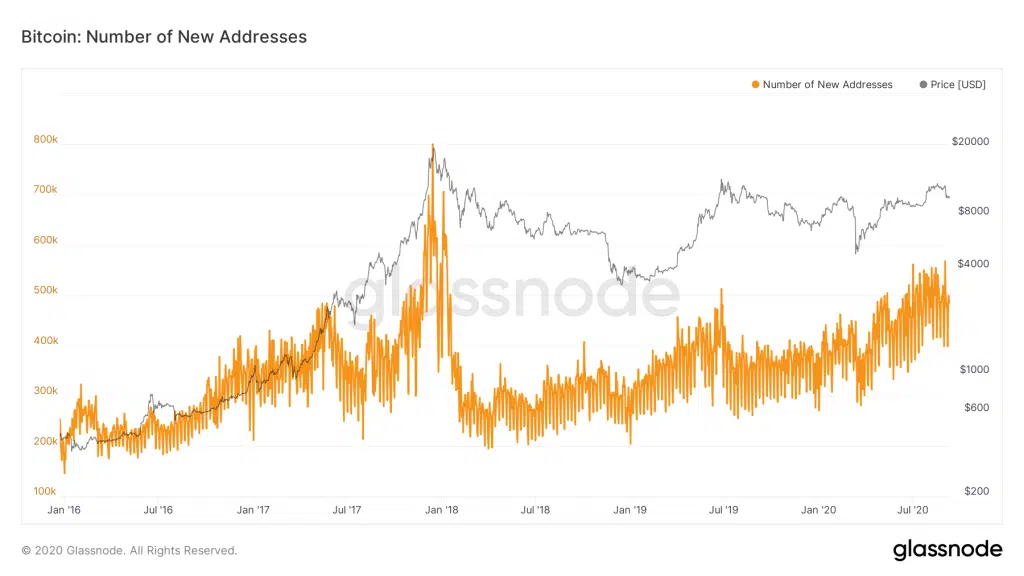 Ultrapassando a casa das 500 mil carteiras de Bitcoin, este expressivo número de certa forma representa o segundo topo histórico de endereços criados, ficando atrás apenas do período da bull run que ocorreu no final de 2017, início de 2018.