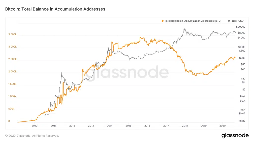 Os endereços de acumulação são definidos como endereços que nunca gastaram fundos ou transacionaram Bitcoin.
