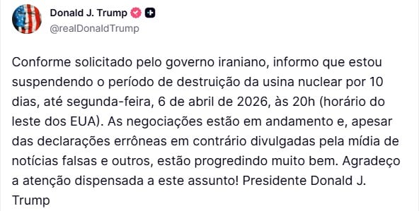 No entanto, o cenário começou a se transformar após uma sinalização direta da Casa Branca. Donald Trump anunciou uma pausa de 10 dias nos ataques à infraestrutura energética do Irã, citando avanços em negociações diplomáticas.