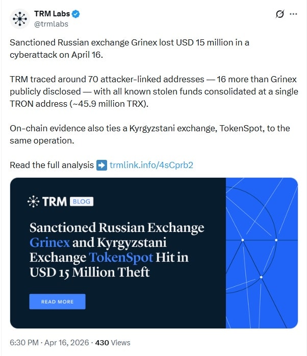 A exchange de criptomoedas Grinex, associada à Rússia, suspendeu as operações após um ataque que drenou mais de 1 bilhão de rublos em ativos digitais, algo em torno de US$ 13 milhões a US$ 14 milhões.