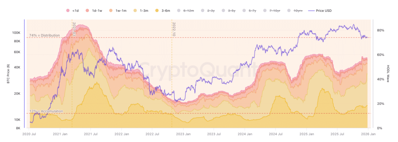Os gráficos on-chain revelam que a estrutura do mercado mudou de forma relevante nas últimas semanas. Os investidores de curto prazo, conhecidos como STHs, aumentaram sua participação na oferta disponível. Esse movimento, no entanto, não sinaliza um fluxo saudável de novos compradores. Pelo contrário, destaca a presença de investidores presos em posições sem lucro, o que reforça um clima de pressão constante sobre o preço.