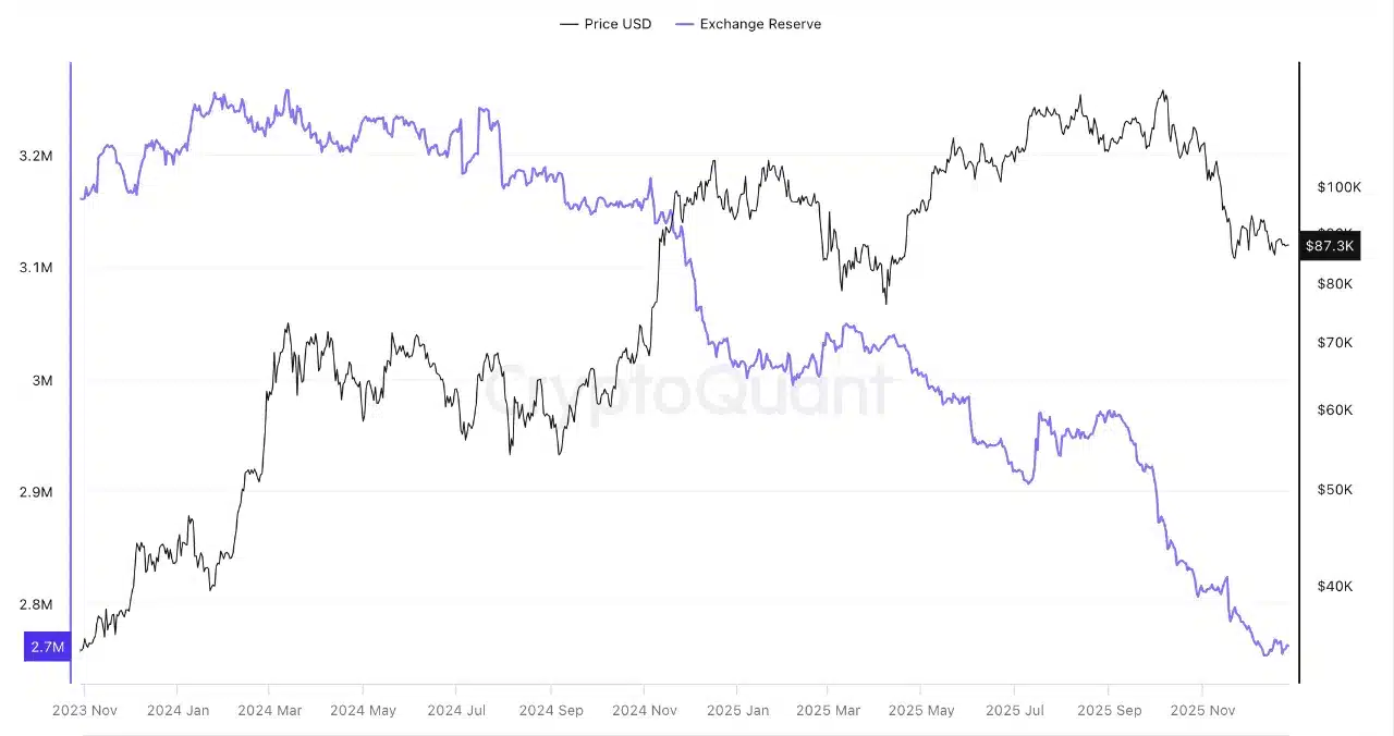 Outro dado relevante aparece nas reservas de Bitcoin das exchanges. Os níveis estão entre os mais baixos já registrados. Normalmente, esse cenário representa força estrutural, pois indica menor oferta disponível para venda. Contudo, no momento atual, ele revela falta de liquidez suficiente para absorver movimentos de venda inesperados.