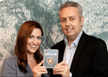 O presidente e a vice-presidente da Great Collections segurando a moeda de 1.000 Bitcoins