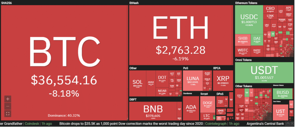 Apesar de ter se mantido pela manhã desta quinta-feira, o mercado sucumbiu no início da tarde aqui no Brasil e no momento desta redação o bitcoin estava caindo -8%, cotado na faixa dos US$ 36.500, já tendo ido dar uma passada na faixa dos US$ 35.500.