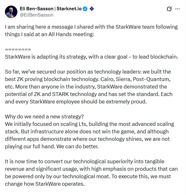 A StarkWare vai separar suas atividades em duas unidades de negócio. Assim, um time ficará dedicado a aplicações, enquanto outro seguirá com o desenvolvimento do Starknet. Além disso, Ben-Sasson afirmou que a empresa ficou ‘grande demais’ para a estratégia atual e, portanto, precisa cortar para se mover mais rápido.