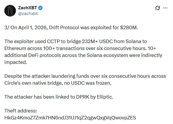 Ao mesmo tempo, o episódio aumentou as críticas à Circle por não congelar rapidamente carteiras ligadas ao explorador. Segundo ZachXBT, o atacante teria usado o CCTP para transferir mais de US$ 232 milhões em USDC da Solana para a Ethereum em mais de 100 transações.