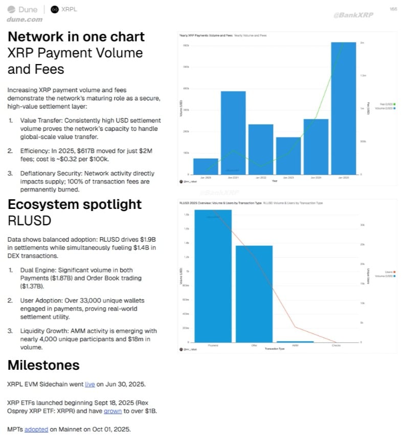 A XRP Ledger reforçou sua eficiência em 2025 ao liquidar US$ 617 bilhões em valor enquanto manteve apenas US$ 2 milhões em taxas, segundo a Dune Analytics. Mesmo com esse volume expressivo, a rede preservou custos extremamente baixos.