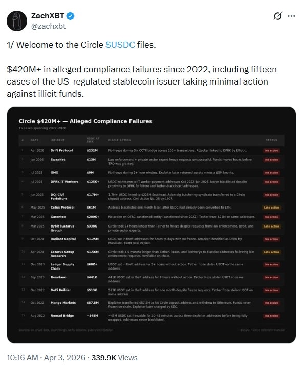 O investigador on-chain ZachXBT acusou a Circle, emissora do USDC, de agir lentamente para congelar fundos ligados a crimes e hacks. Segundo ele, atrasos repetidos teriam permitido a movimentação de mais de US$ 420 milhões em ‘fundos ilícitos’ antes de bloqueios efetivos. Além disso, a crítica reaqueceu o debate sobre o papel de stablecoins centralizadas em casos de fraude, já que o emissor possui funções de congelamento no contrato.