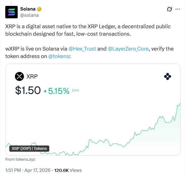 • Solana informou que o XRP empacotado (wXRP) já está ativo na blockchain por meio da Hex Trust e da LayerZero